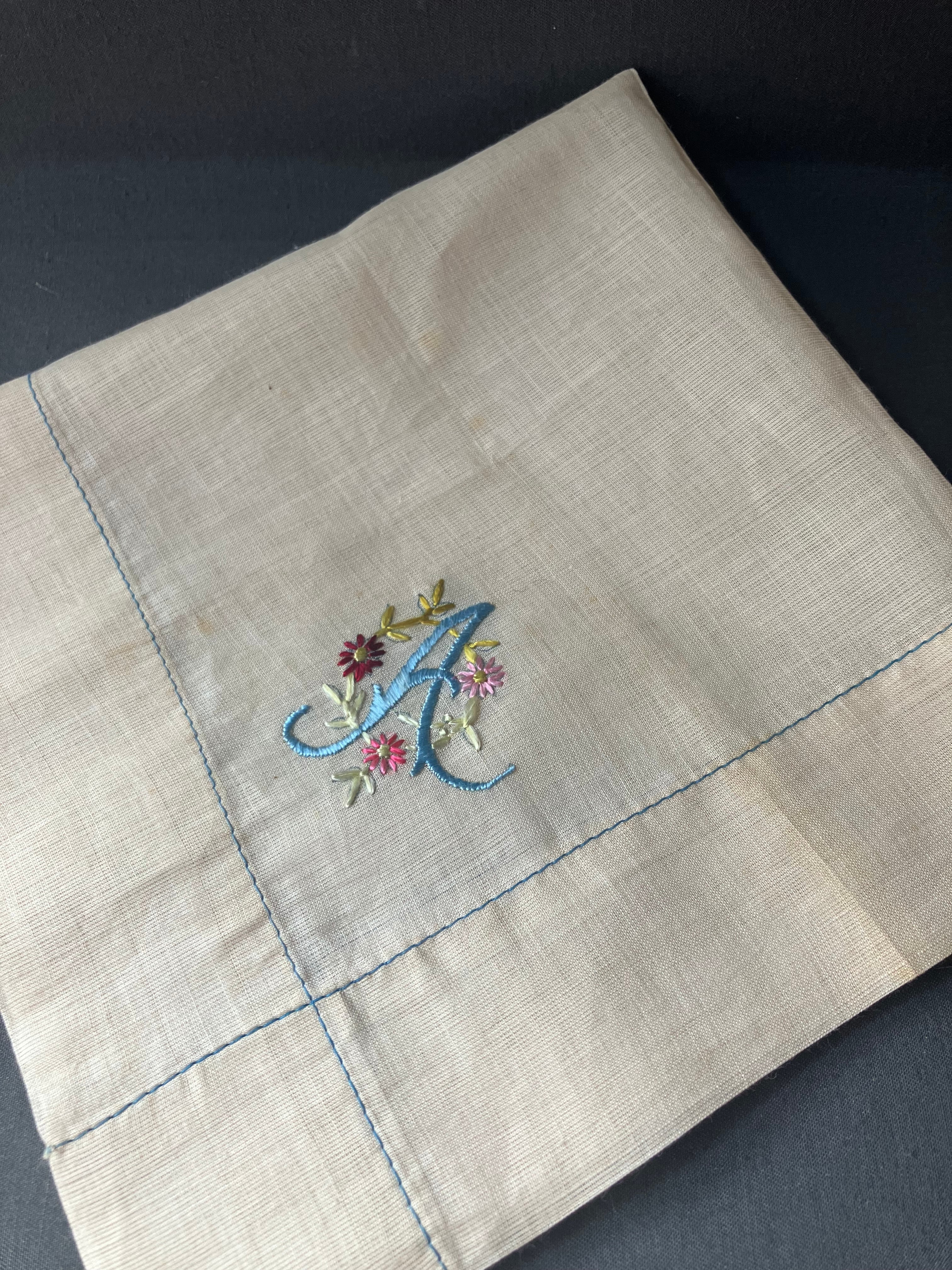 5本 リネンにモノグラムAとお花の刺繍が素晴らしいハンキーとクロッシェレースの襟 クロッシェレースのリボン 4本とバランシエンヌ1本の盛り沢山なセットです。フランスアンティーク。