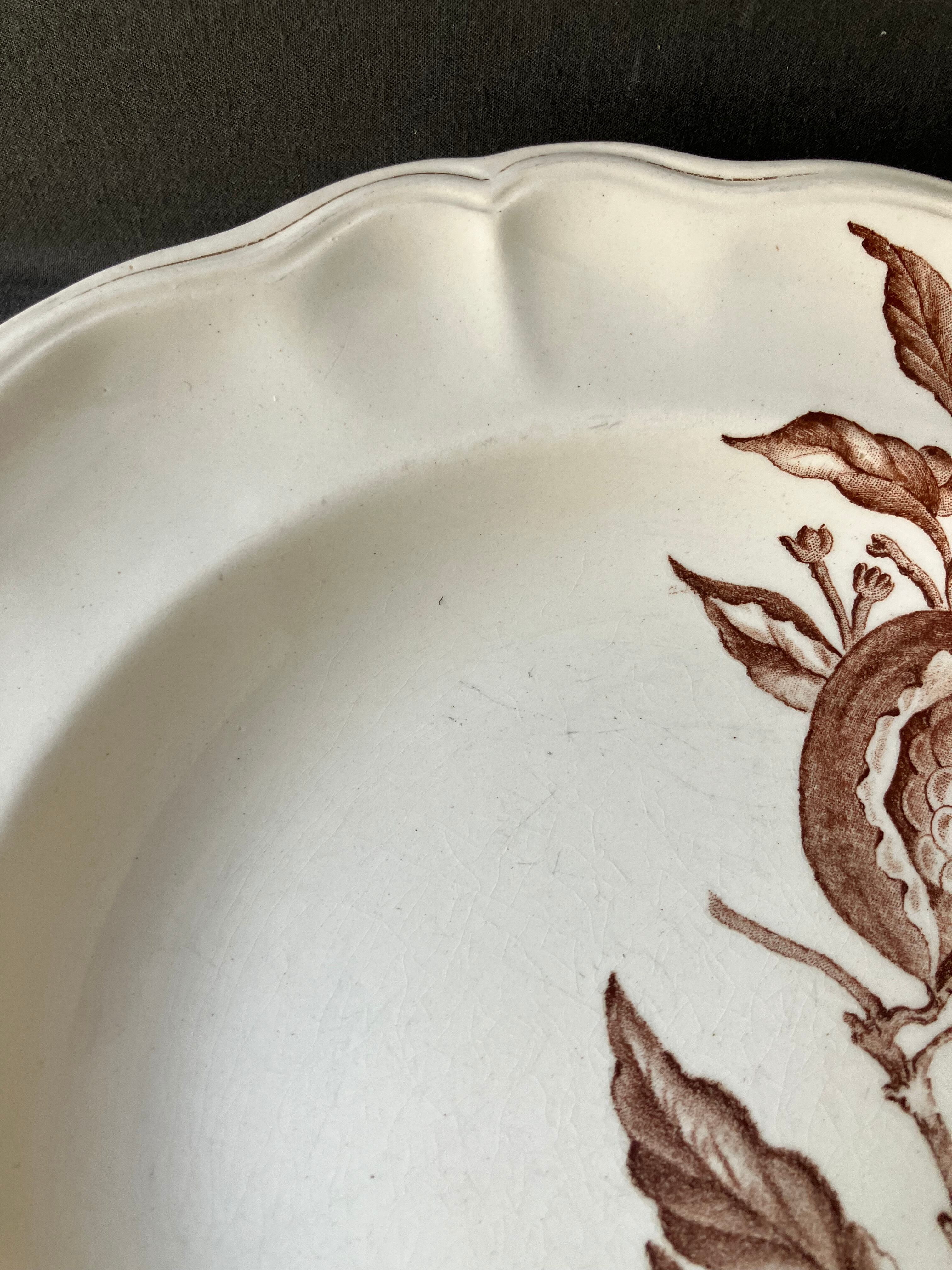 ・直径 25.5㎝ longchamp 花リムプレートにザクロの絵付けが素晴らしいプレートです。いつもの花リムプレートが絵付けによって華やかになりますね。表面に5㎜程のスレこちらはあまり目立ちません。裏面に1㎝程のスレカケがあります。1920年から30年。フランスアンティーク。
