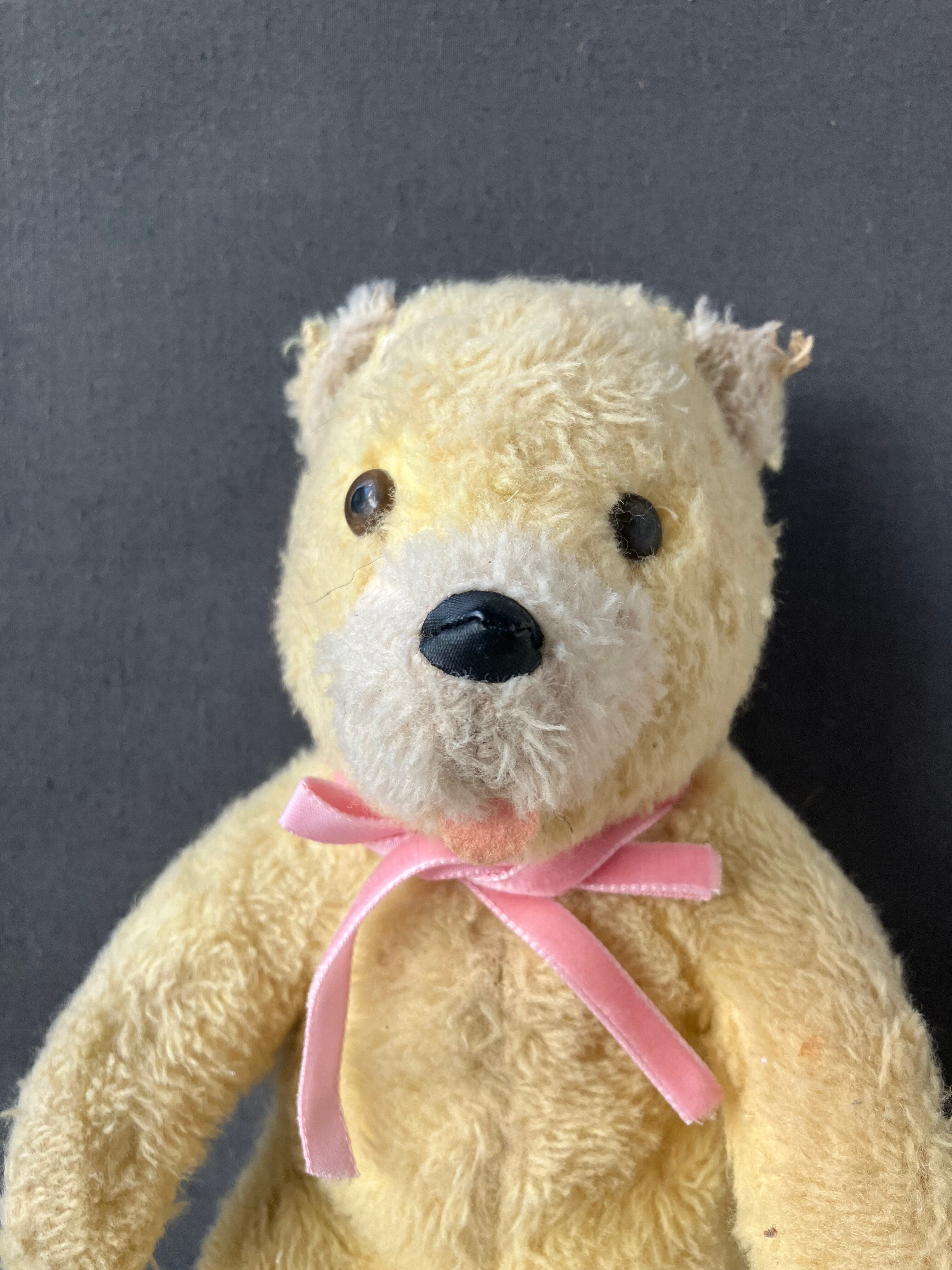 イエローホワイトモヘア ピンクのぺろっが可愛いベアちゃんです。ぺろと同じお色のultramodのリボンお付けしました。1930年から40年。フランスビンテージ。