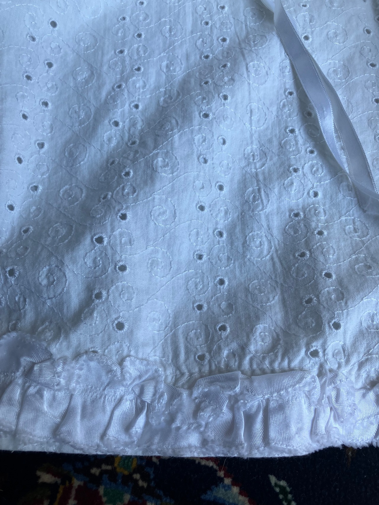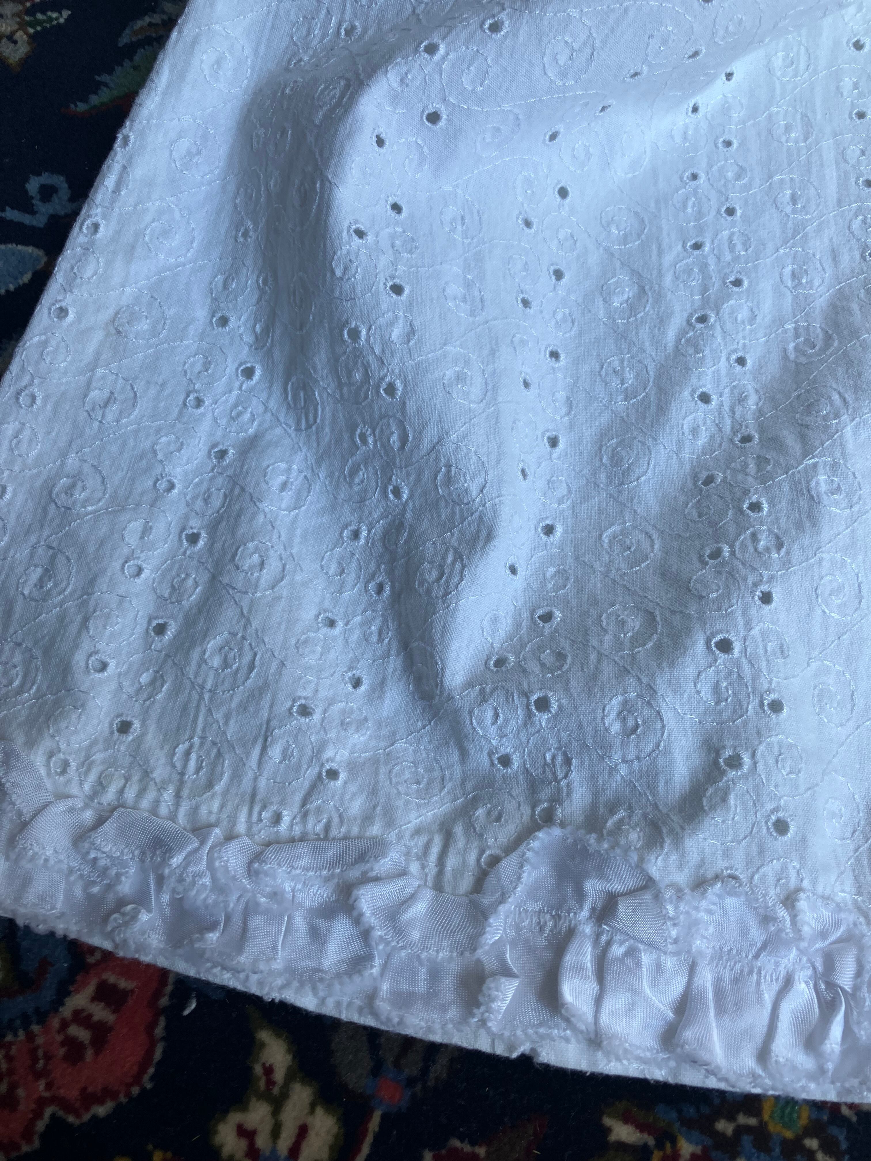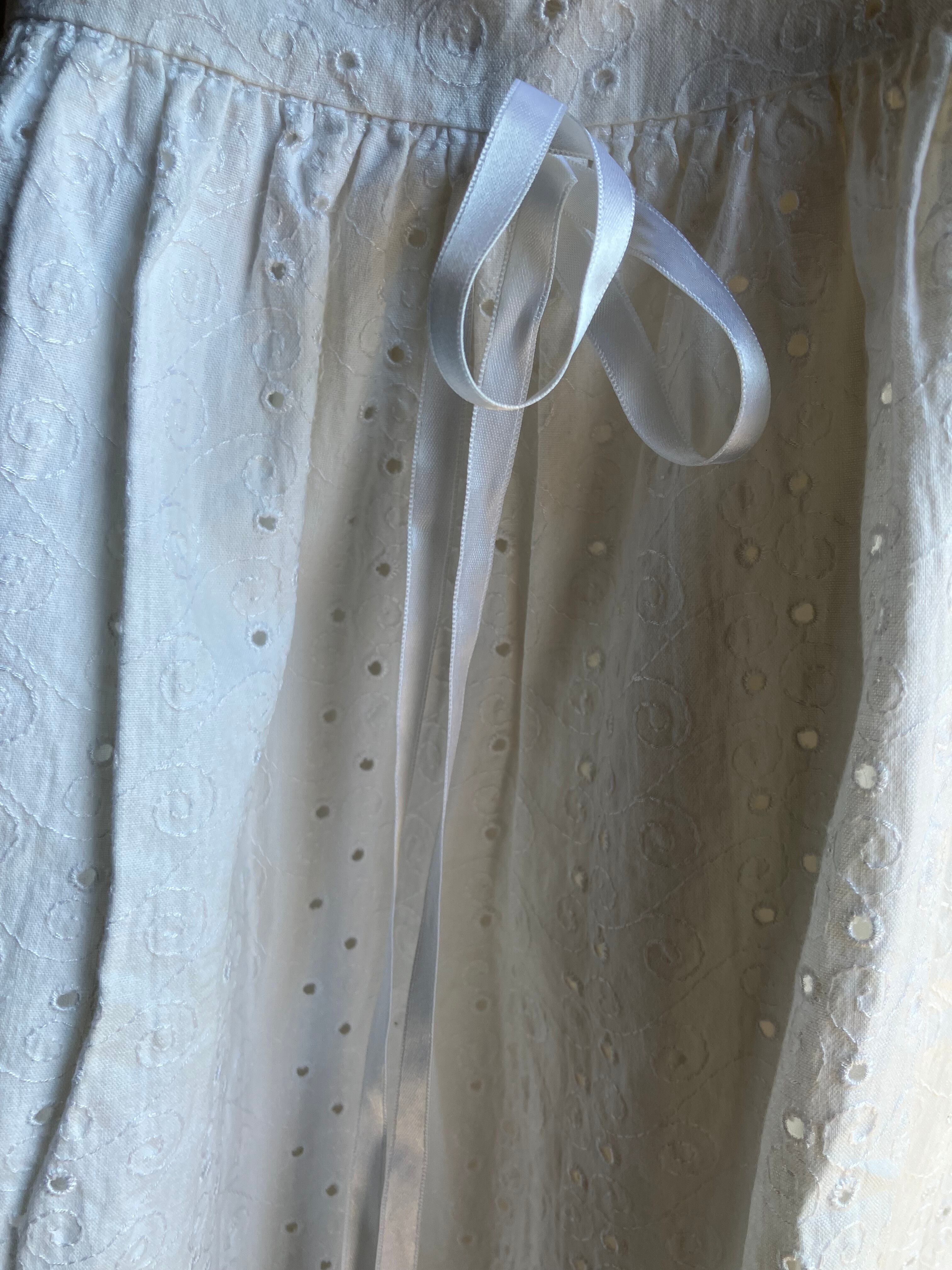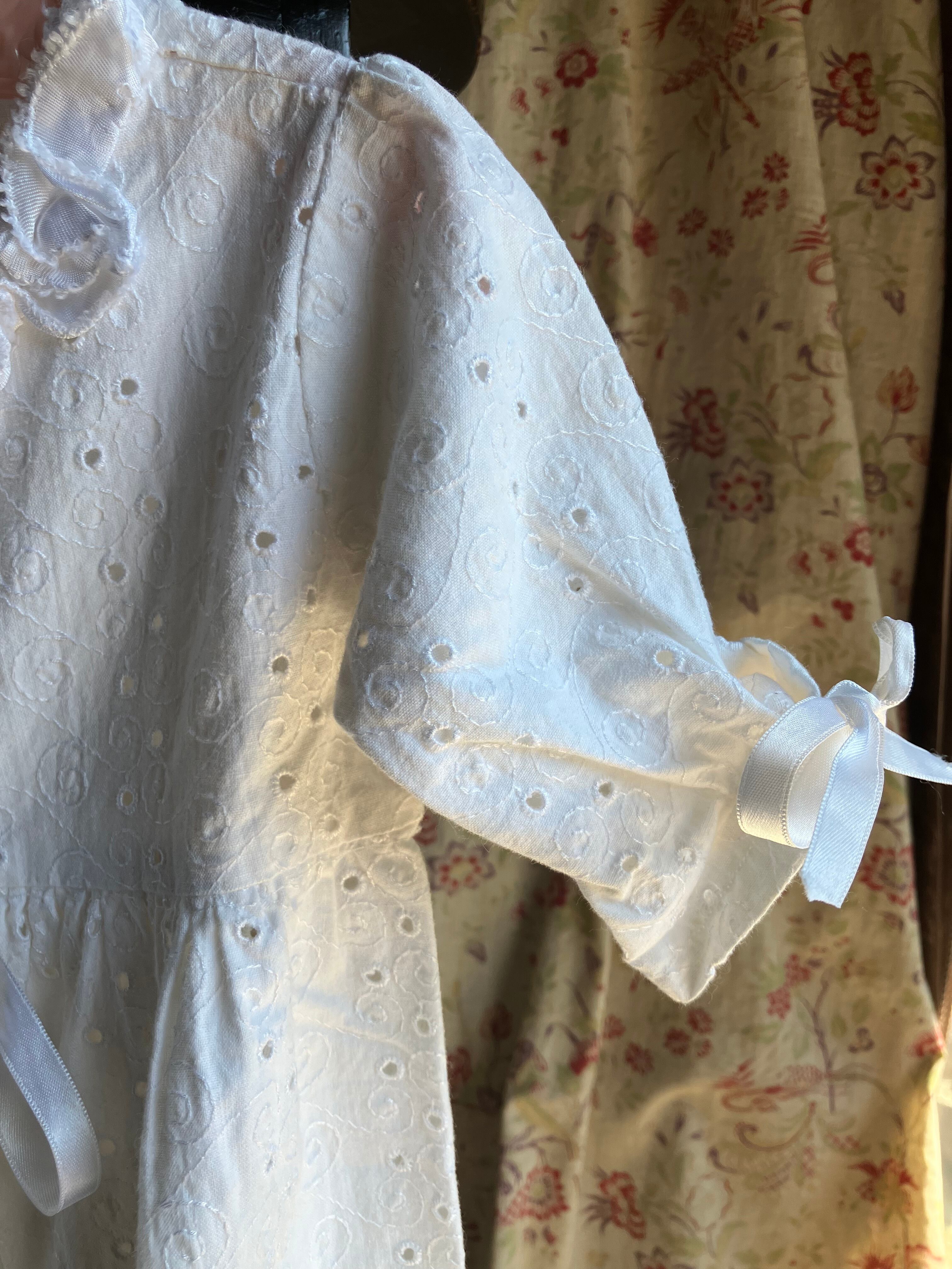 ・バスト 26.5㎝ 丈 75㎝ コットンローンにカットワーク刺繍のロングベビードレスです。袖とトップにリボンが付いています。フランスビンテージ。