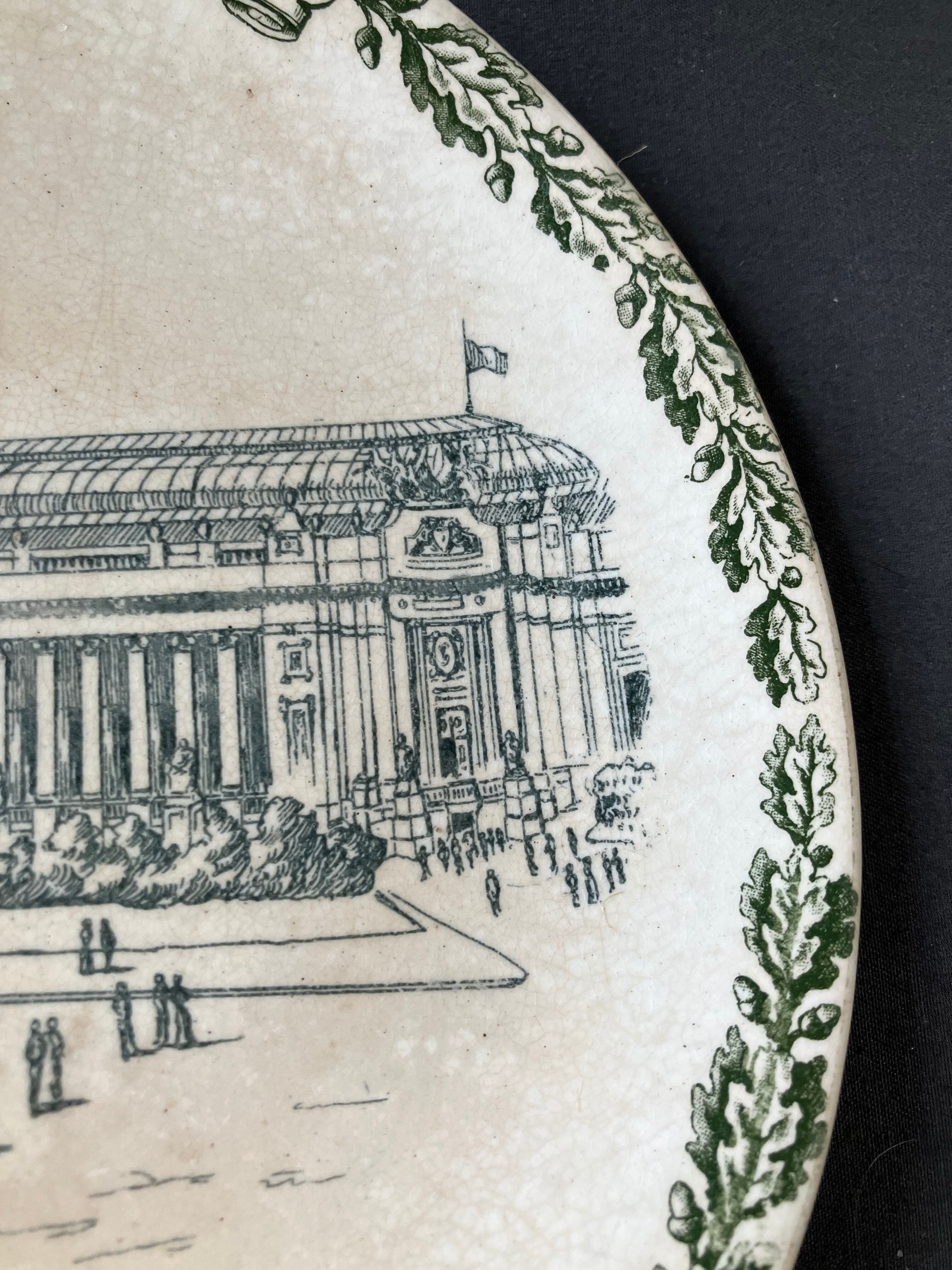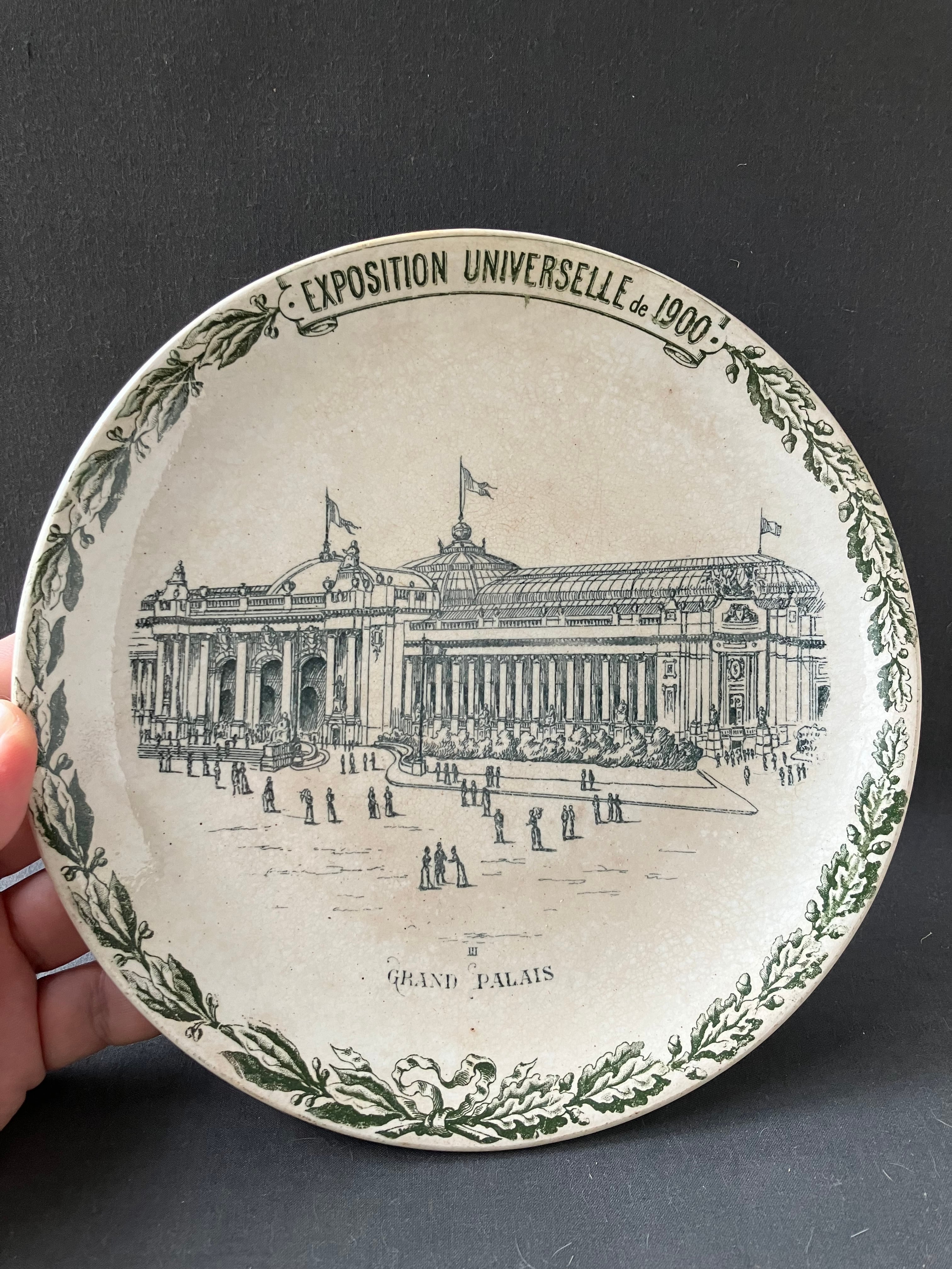 ・直径 19.5㎝ 1900年 EXPOSGTIONの記念プレートです。華やかなグランパレが描かれています。薄らとシミはございますが、ヒビカケなく経年の割に良い状態です。フランスアンティーク。