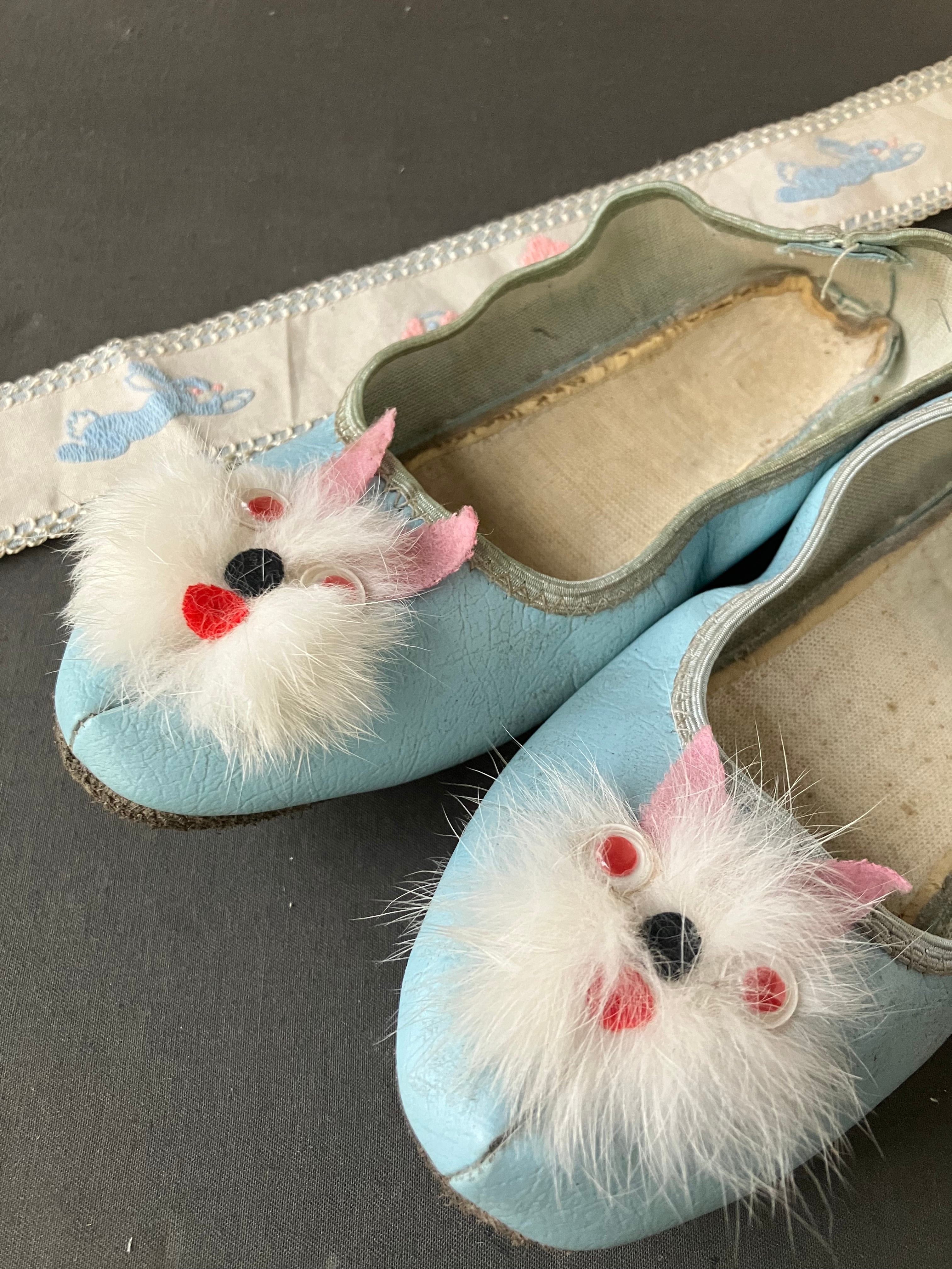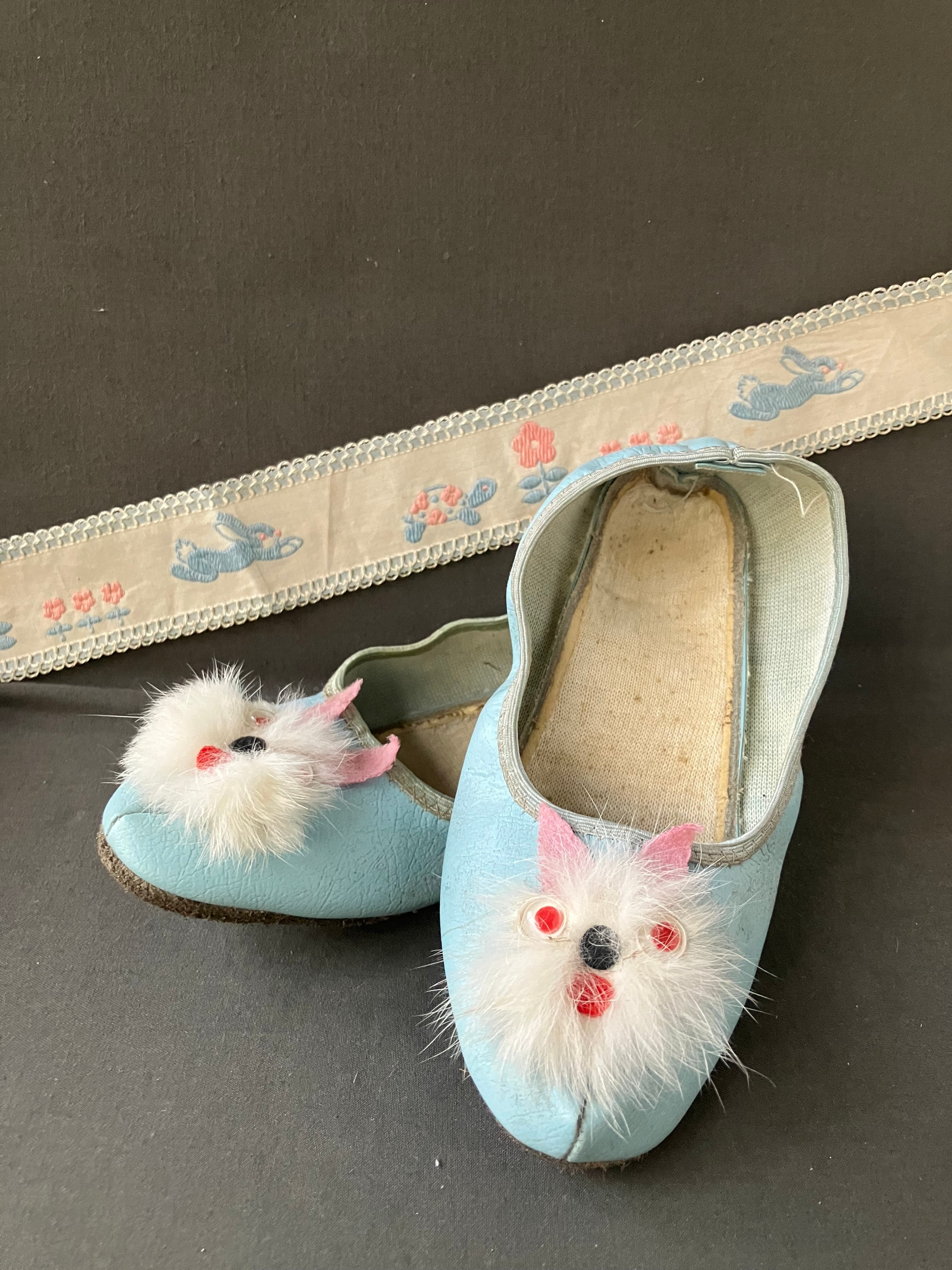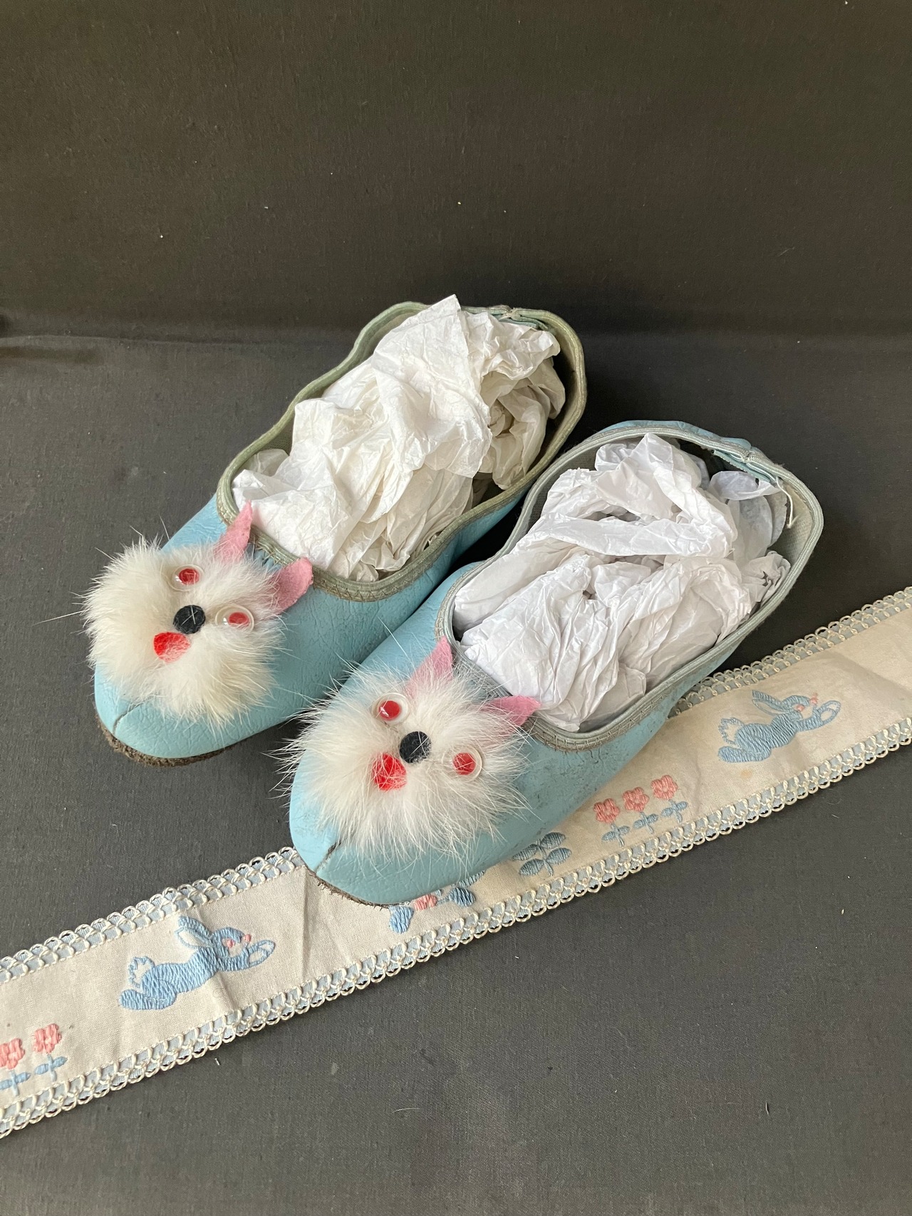 ベビーシューズです。うさぎとカメの刺繍リボンもセットです。1930年から40年。フランスビンテージ。