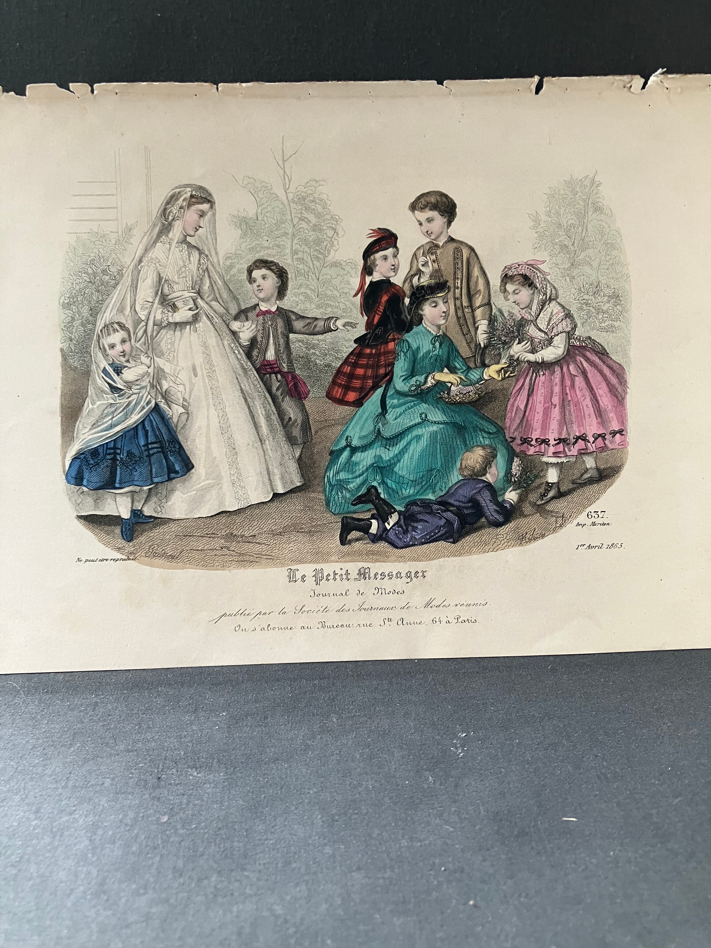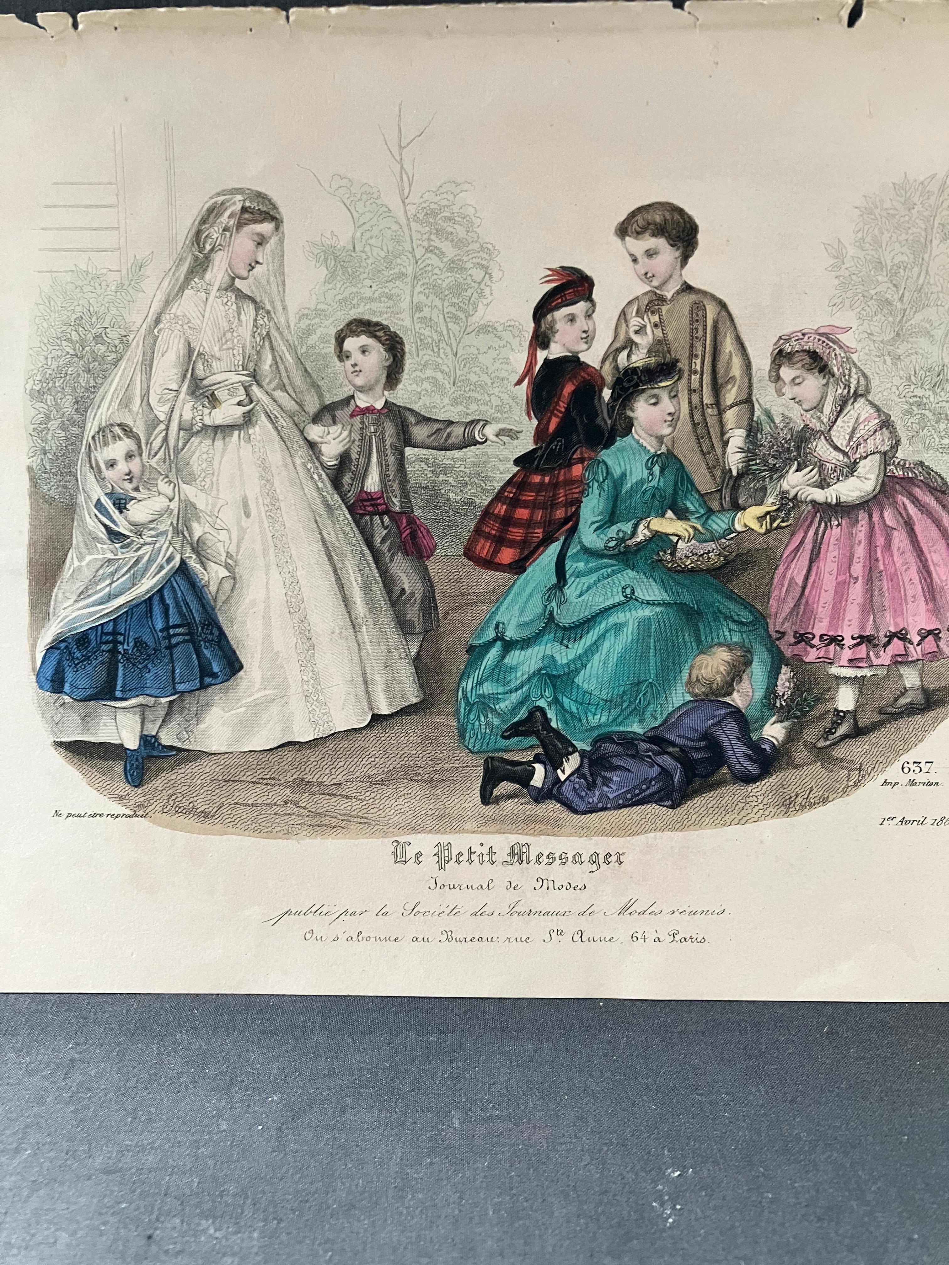 ・縦 19㎝ 横 27㎝ 1865年の貴重なモード画です。花嫁さんと7人もの子女達が描かれている珍しいモード画です。フランスアンティーク。