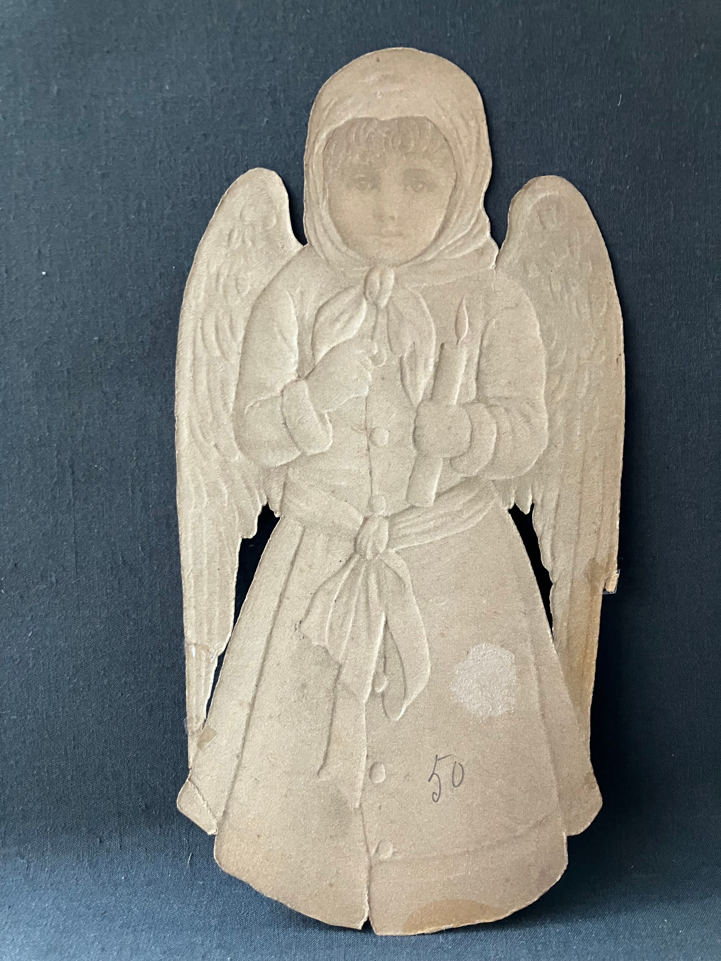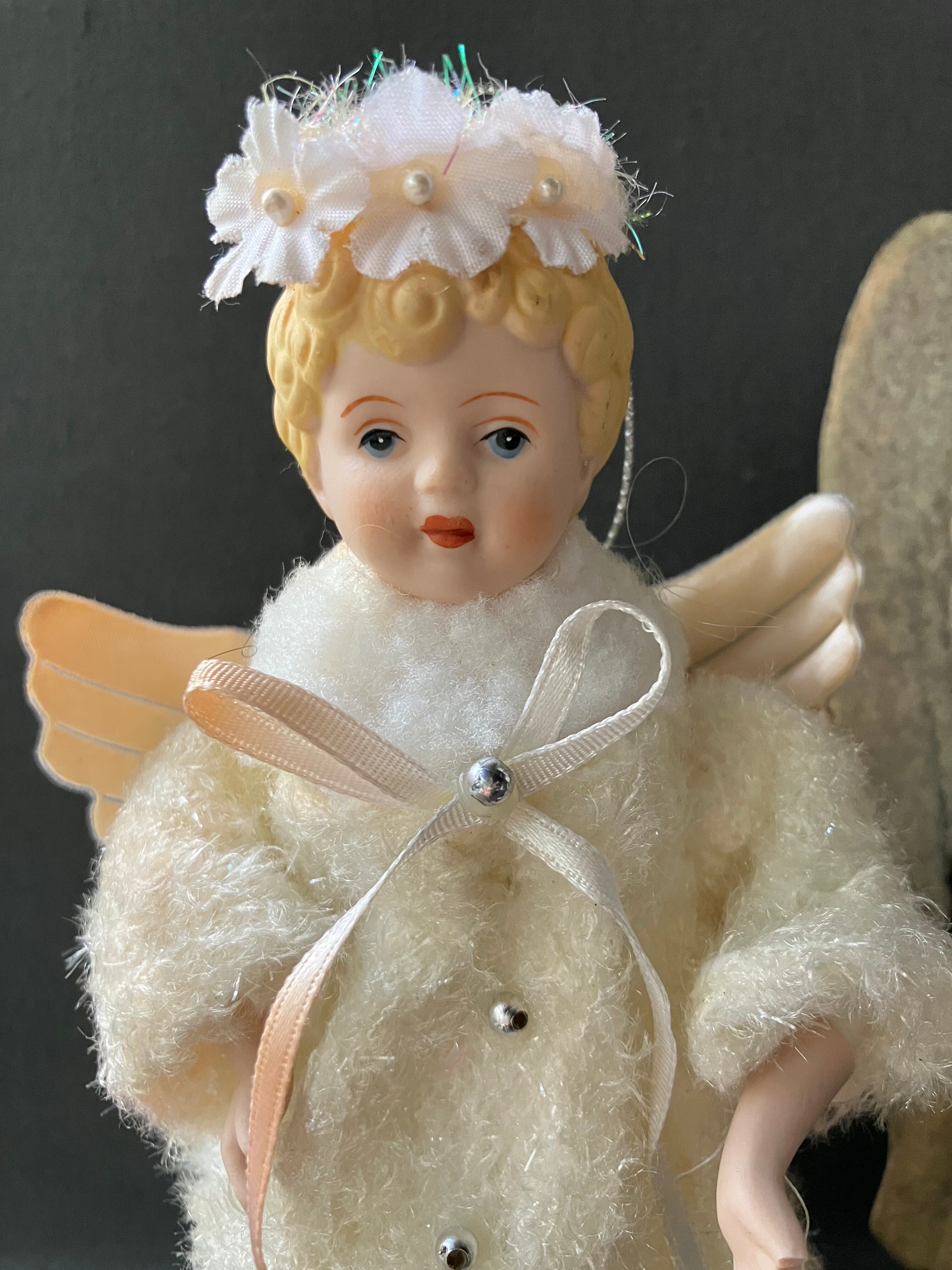 クリスマスツリーのトップに付けるエンジェルです。ベッドとハンドはビスクです。同じ世界観の大きなクロモスとセットです。クロモスの羽根の先に補修跡あります。ドールはビンテージ。クロモスはアンティークです。