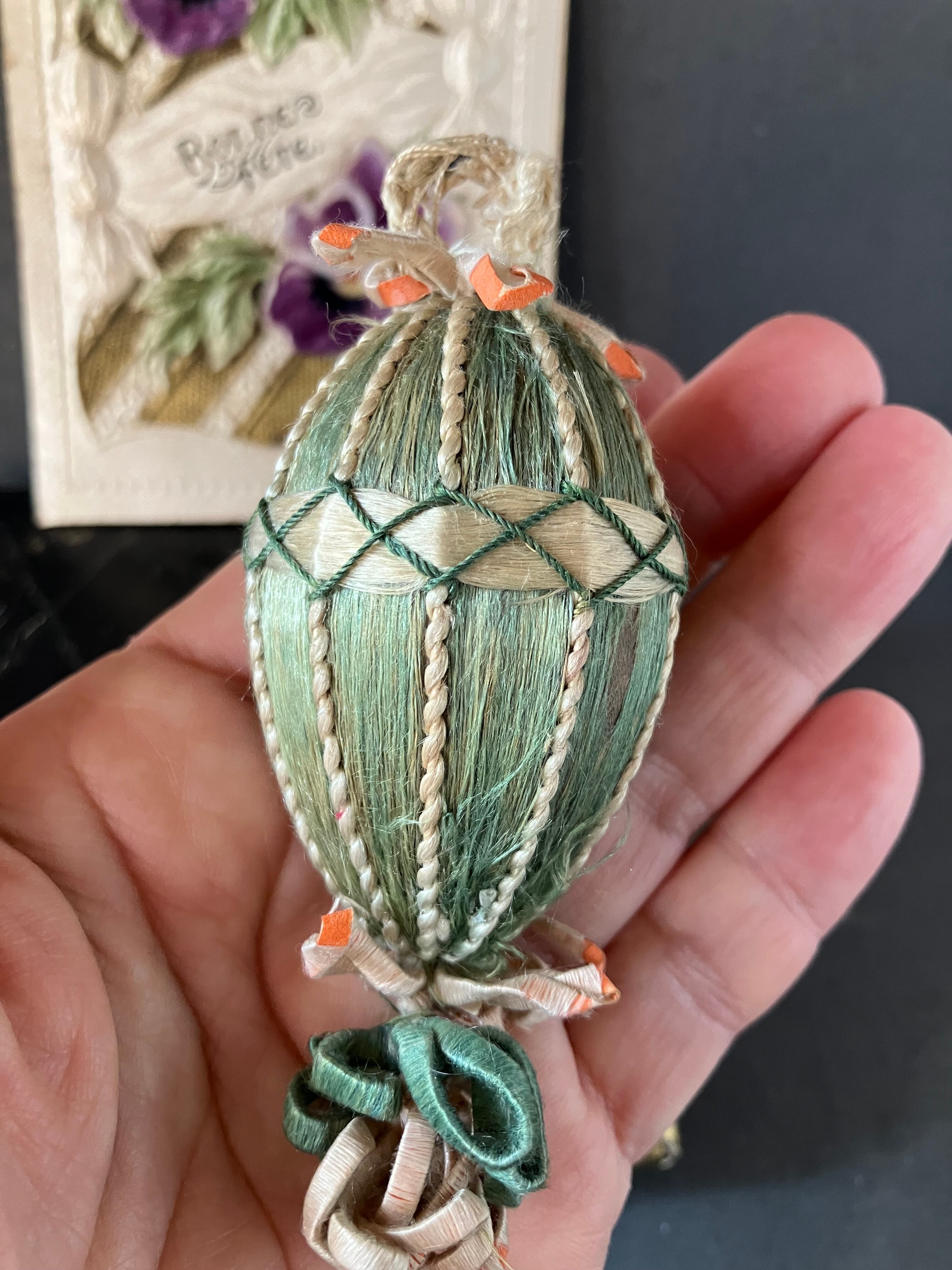 スミレのSAVON BOXです。角に修復跡があります。木製の台に手毬の様に刺繍糸とリボンで作られたオブジェです。boxと色目とサイズがぴったりです。カードもシルクとビロード使いのパンセのカードもスペシャルです。フランスアンティーク。
