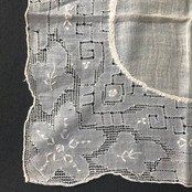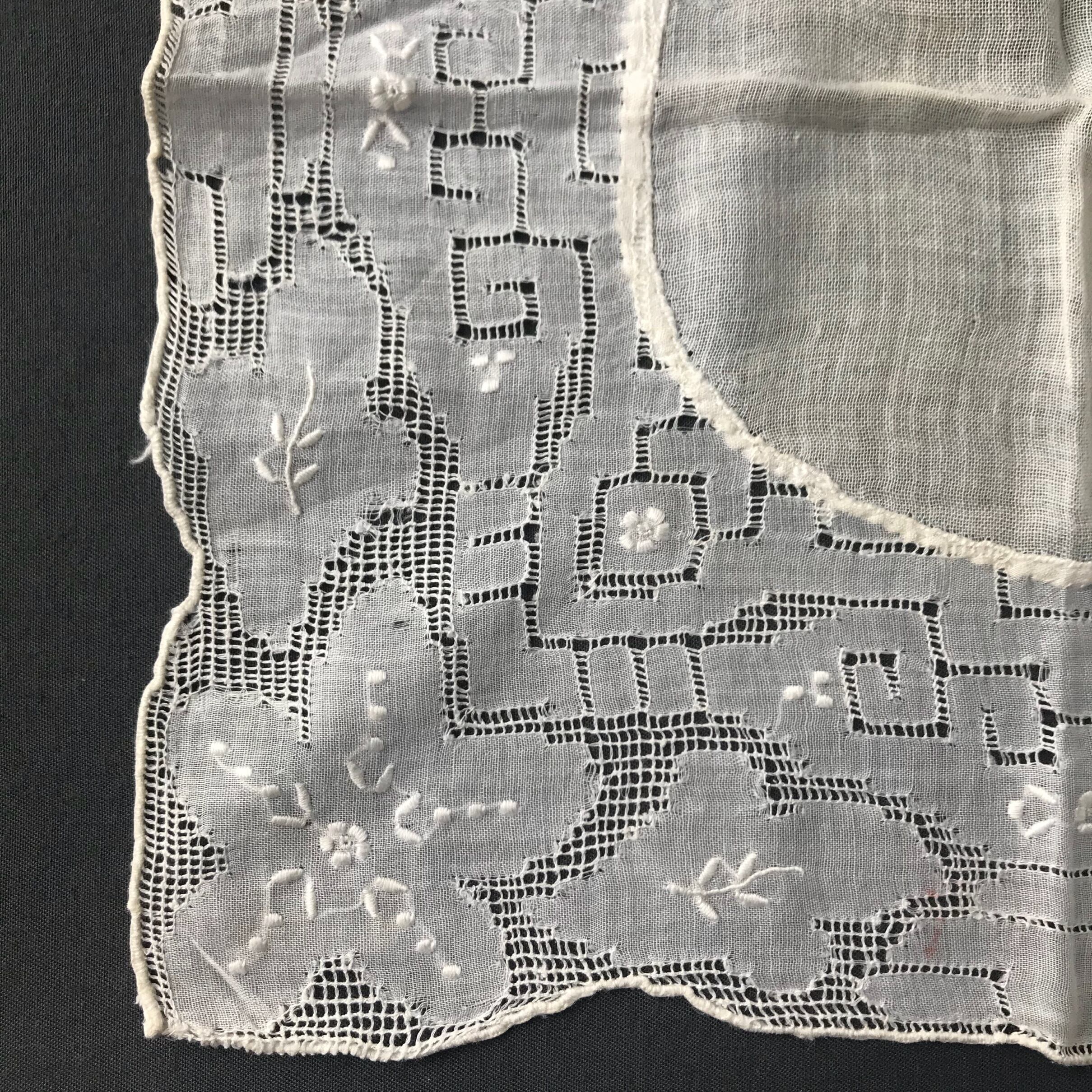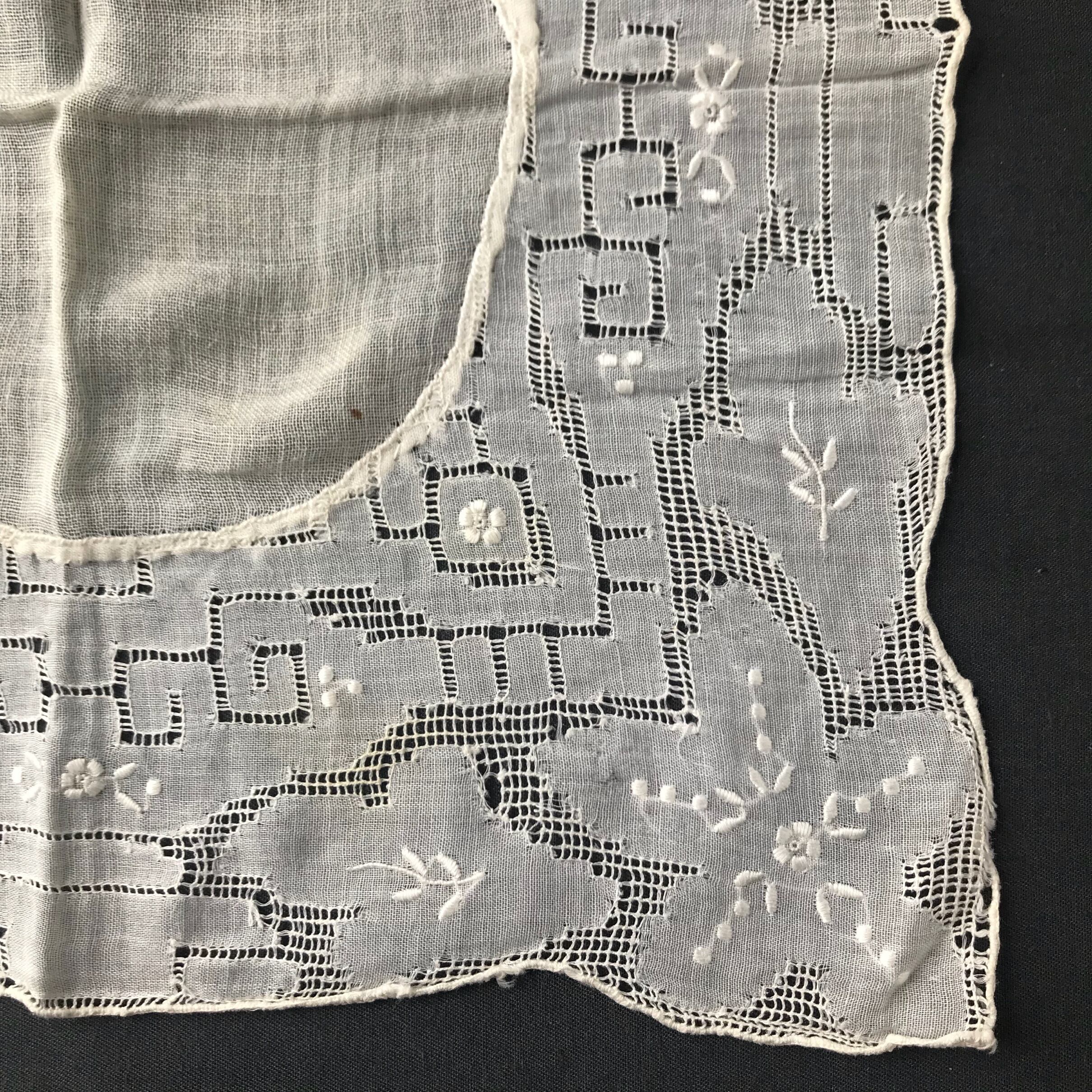 ・縦 25㎝ 横 25㎝ 全てハンドでまずモチーフをつなげ、さらにモチーフひとつひとつに刺繍がされた繊細な繊細なハンキーです。昔のかたの手先の器用さが伺える儚げな刺繍です。フランスアンティーク。