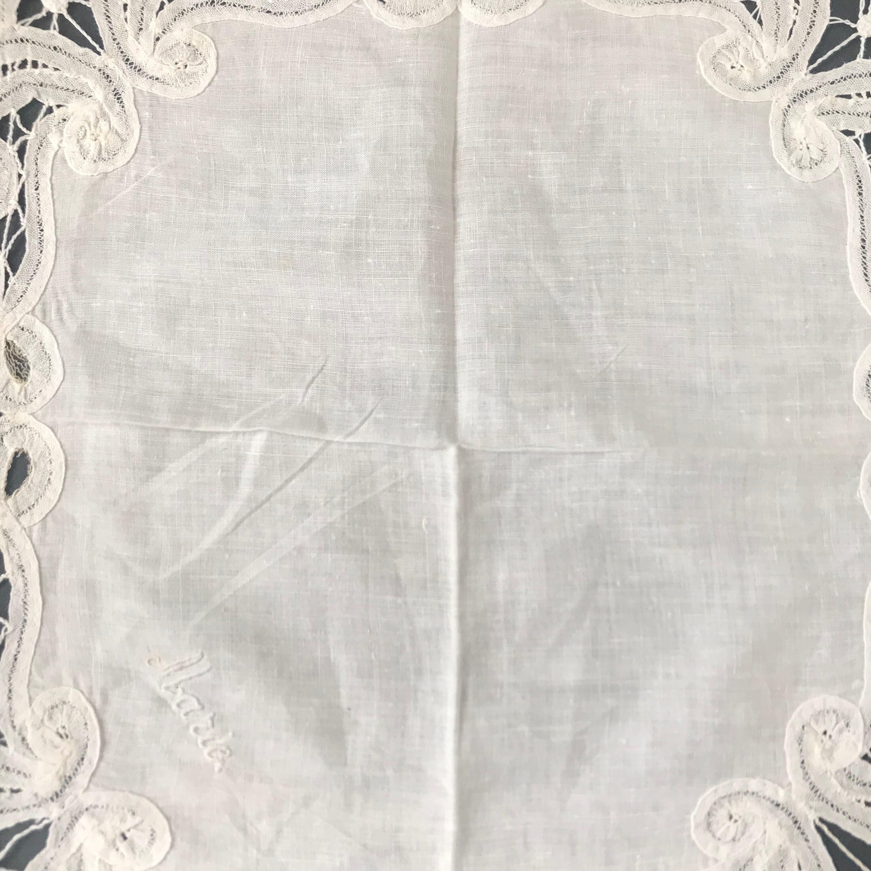 ・縦 27㎝ 横 27㎝ バテンレースにチュールの飾りをつけ、marie の刺繍が入ったウエディング用ハンキーです。飾りチュールは取れているところがありますが、綺麗なハッピーオーラ満載のハンキーです。フランスアンティーク。