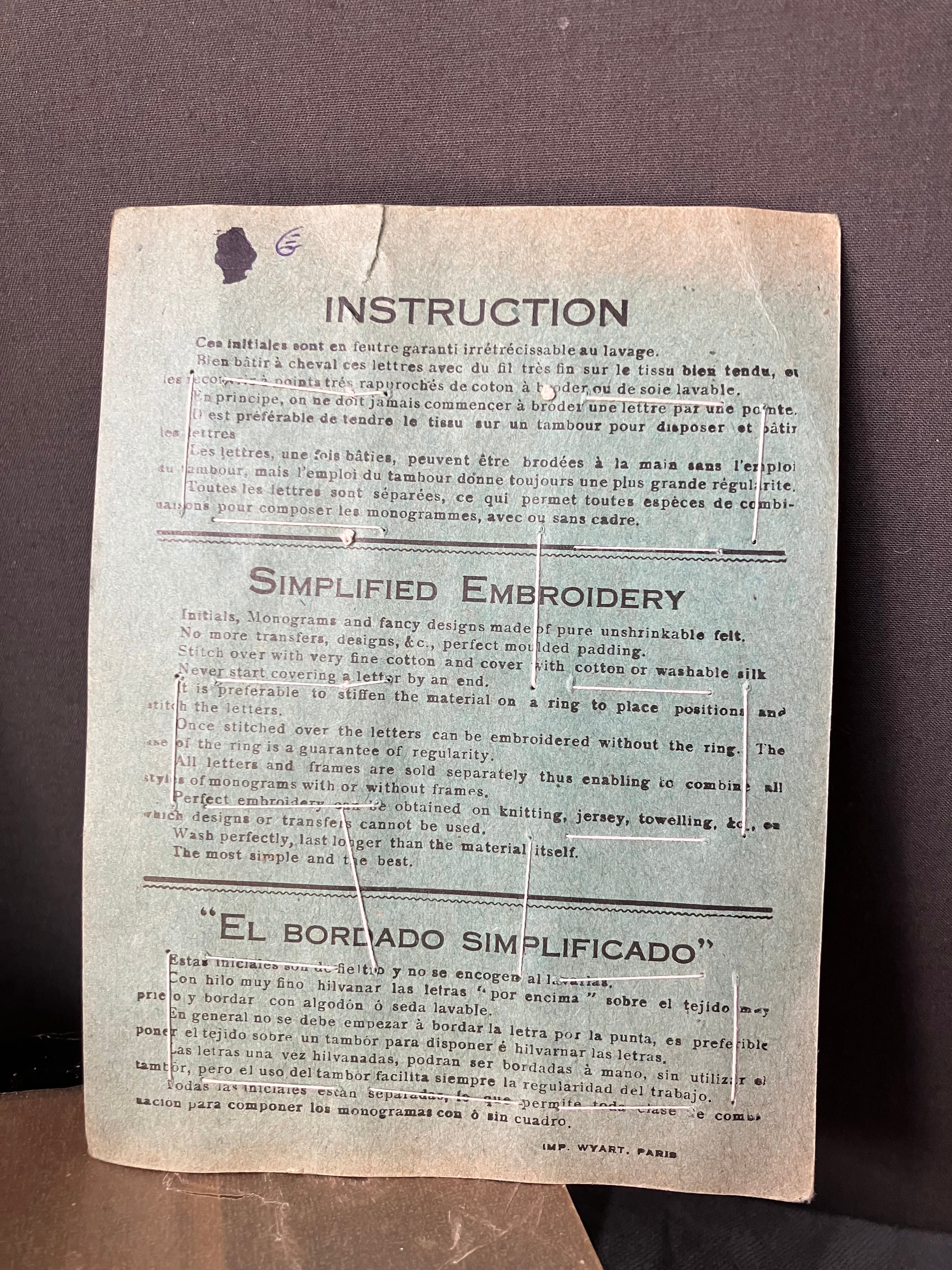 DMCのモノグラムクロスステッチ図案集とモノグラムのHの刺繍パネル、ボタンシート、レース5本とこれが珍しいコロコロさせて、刺繍の図案を作るスタンプのセットです。フランスビンテージ。