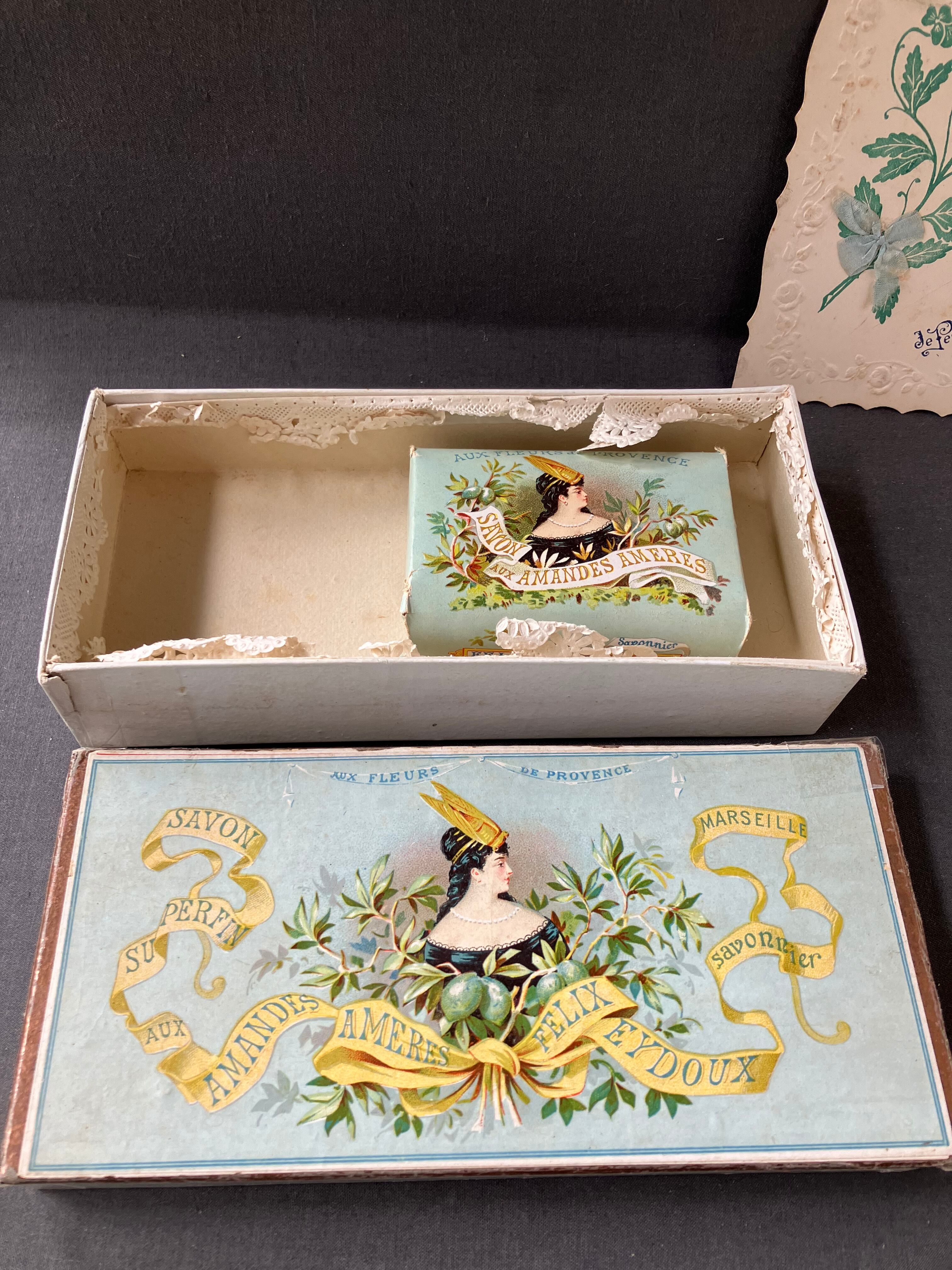 AUXFLEURS のSAVONBOXとSAVONです。レースも残っています。BOXの角には修復跡があります。パンセのカードとセットです。フランスアンティーク。